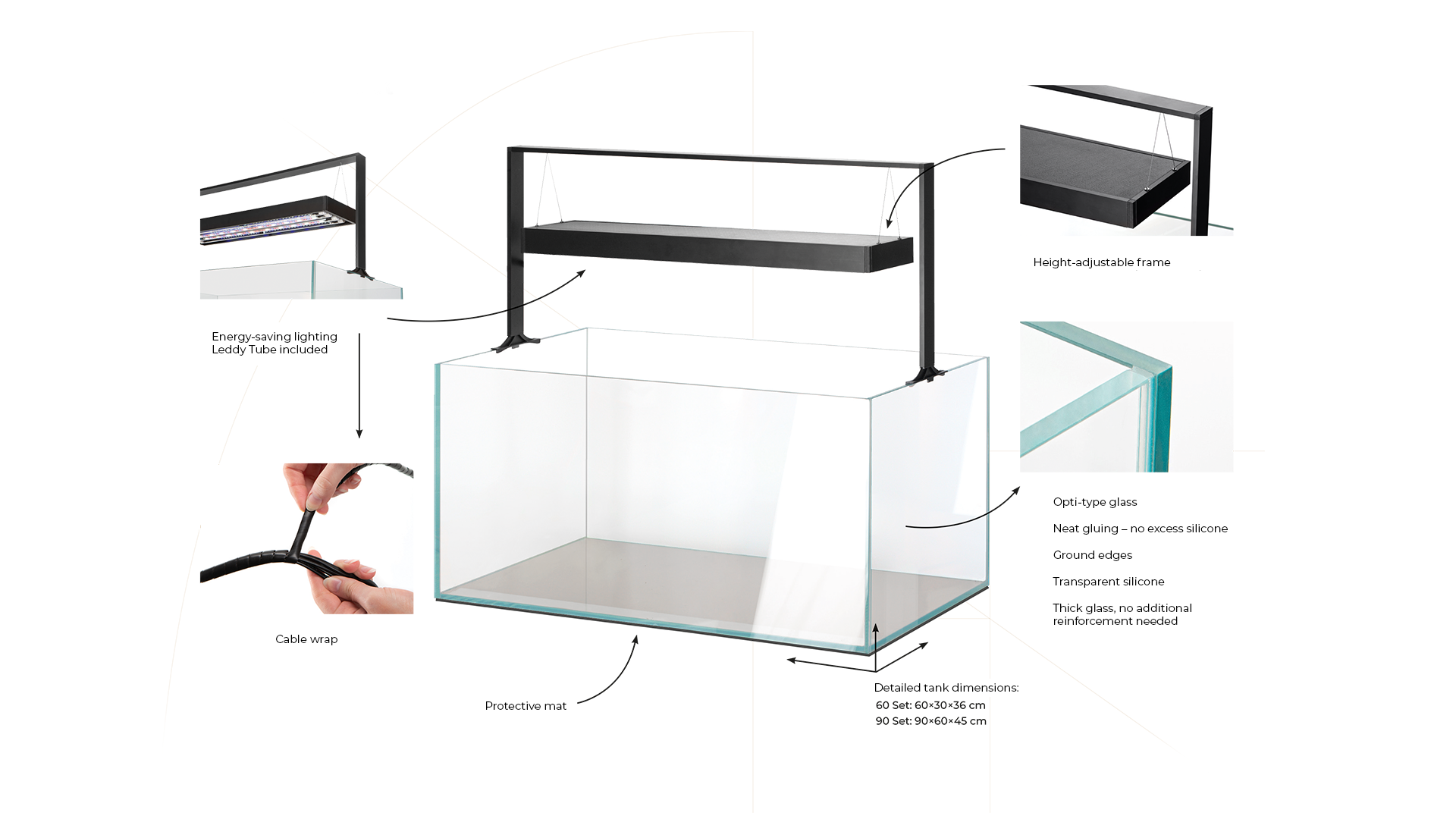 The Leddy Mini set is designed for beginner aquarists, especially children. Durable FLOAT glass and a bottom protection frame for safe use.