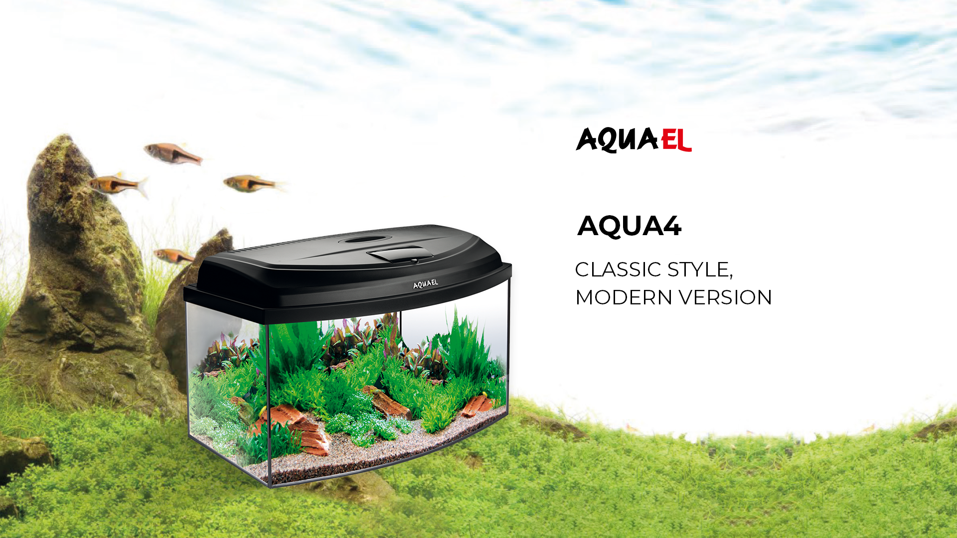 A line of extensively equipped, complete aquarium sets from 40 to 100 cm in length. Classic, fully equipped aquarium sets available in both straight and oval front glass versions.